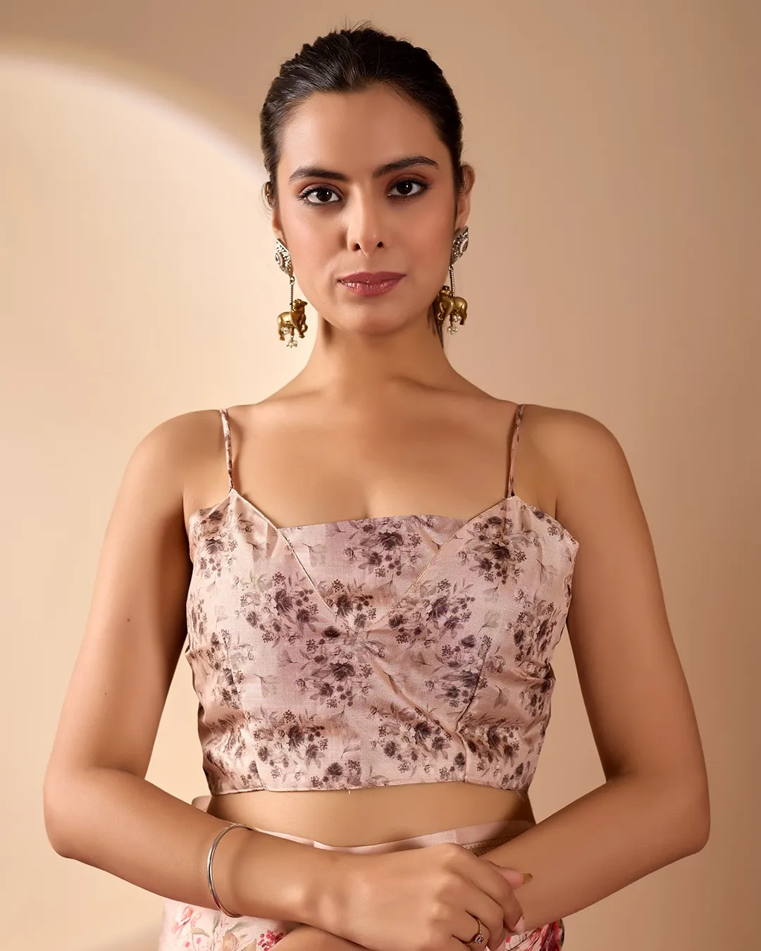 Blouse: Paired with a stunning Contrast Satin Silk Blouse piece. The high-gloss sheen of the satin silk provides a luxurious, dramatic contrast to the subtle print and soft texture of the Lichi Silk saree.