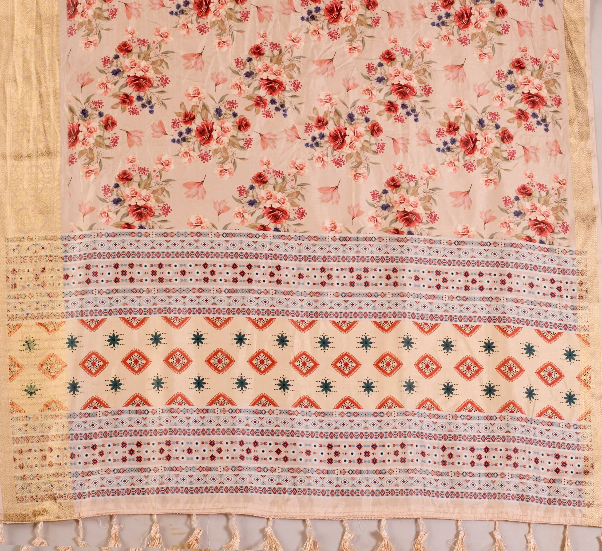 Artistry (Body): Features Enchanting Floral Digital Prints spread across the body. This modern technique provides stunning clarity and a rich, detailed color palette, giving the saree an artistic, contemporary appeal.