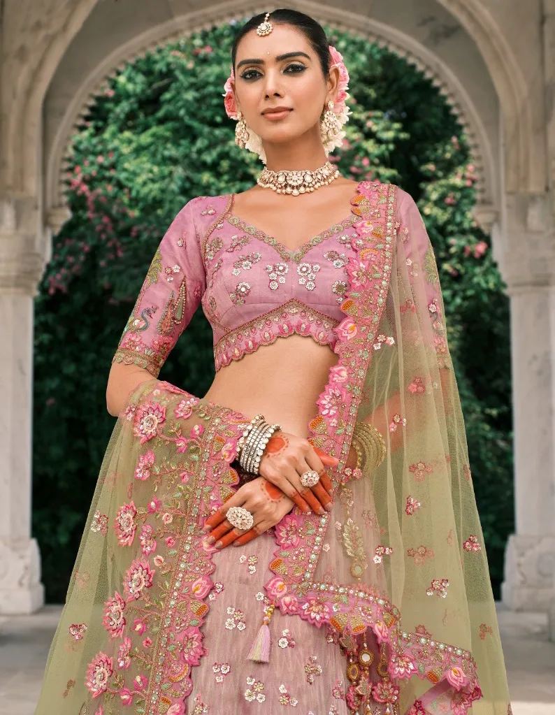 Color & Fabric: The lehenga features a vibrant combination of Pink And Green, colors traditionally associated with happiness and festivity. The Lehenga Fabric is Fancy Silk, known for its beautiful sheen and structured flow, ensuring a regal look.