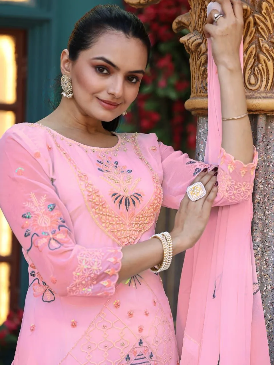 Color & Fabric: The soothing Pinkย color, combined with the soft, flowing Georgette fabric of the top and dupatta, creates an ethereal and feminine appeal.