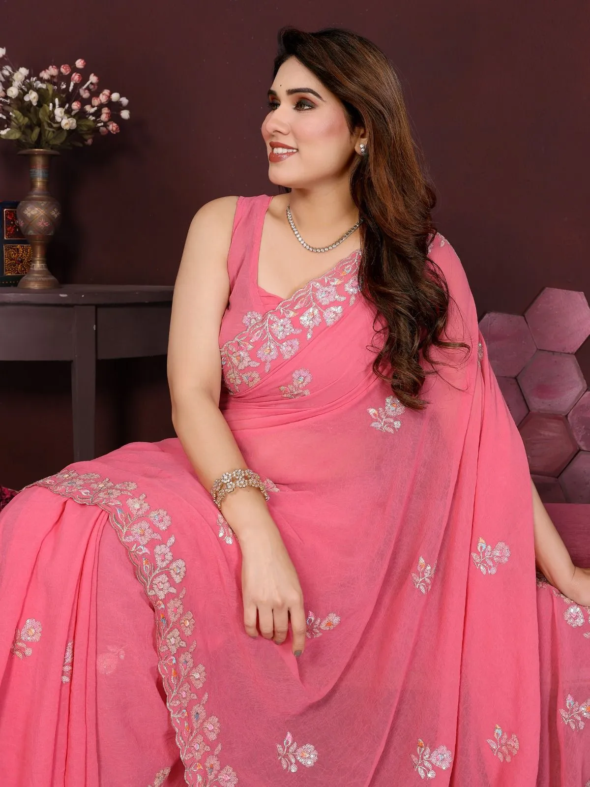 Pink Georgette Silk Embroidered Border Work Fancy Saree