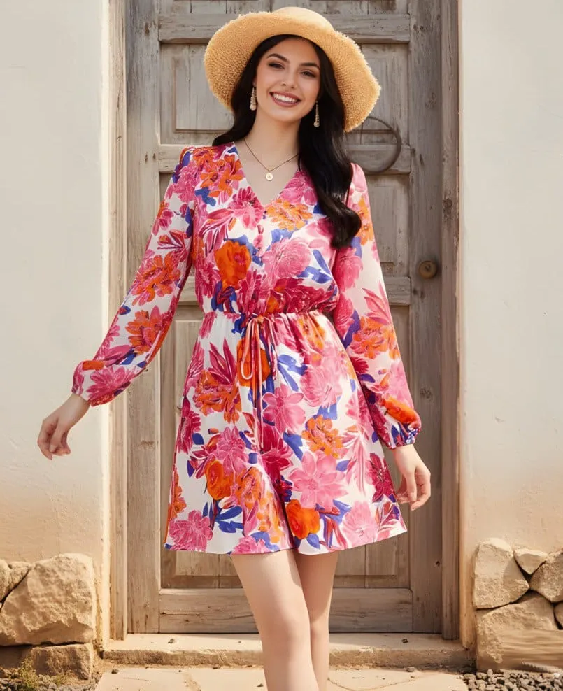 The dress features a flattering V-neckline, enhancing the overall feminine look while adding a modern touch. The full sleeves provide a refined silhouette, making it suitable for all-day wear and slightly cooler weather. The beautiful printed design over the soft pink base adds charm and a fresh, trendy vibe.