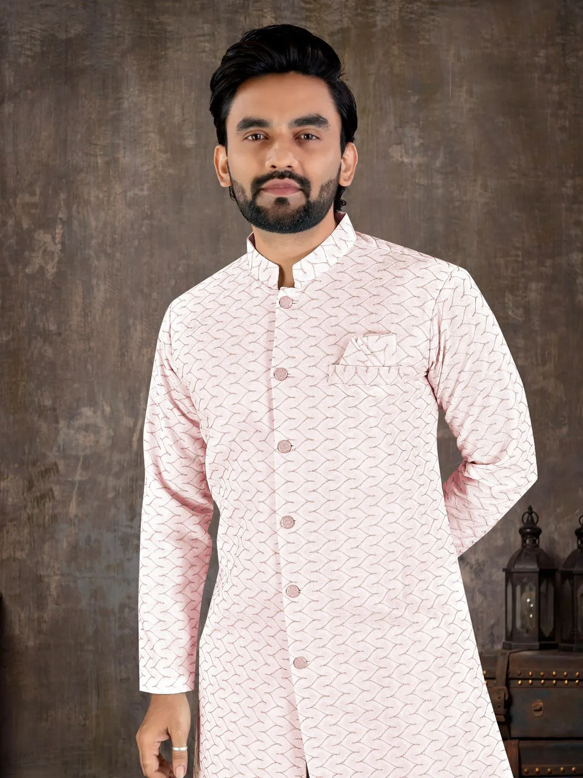 Design: Features a structured, long-line silhouette with a mandarin collar and a buttoned front closure, embodying the contemporary Indo-Western aesthetic.