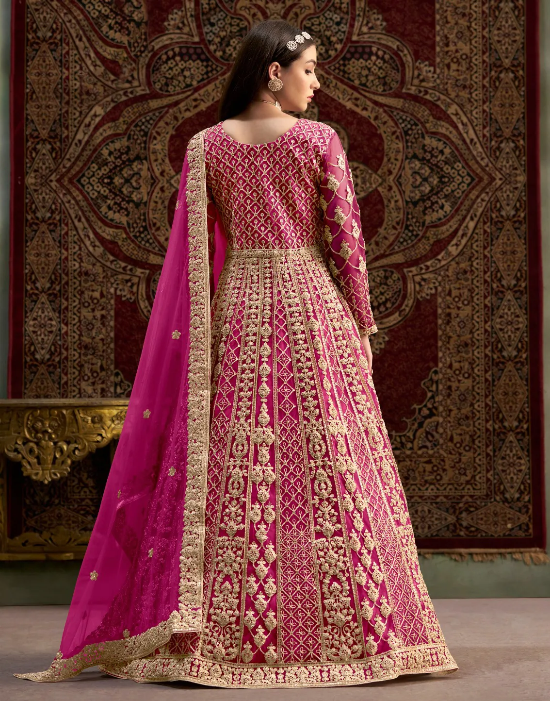 The sheer beauty of the net fabric, combined with the heavy embroidery, creates a grand, traditional appearance that is synonymous with wedding attire. The Pink color provides a sophisticated, modern contrast to the intricate detailing.