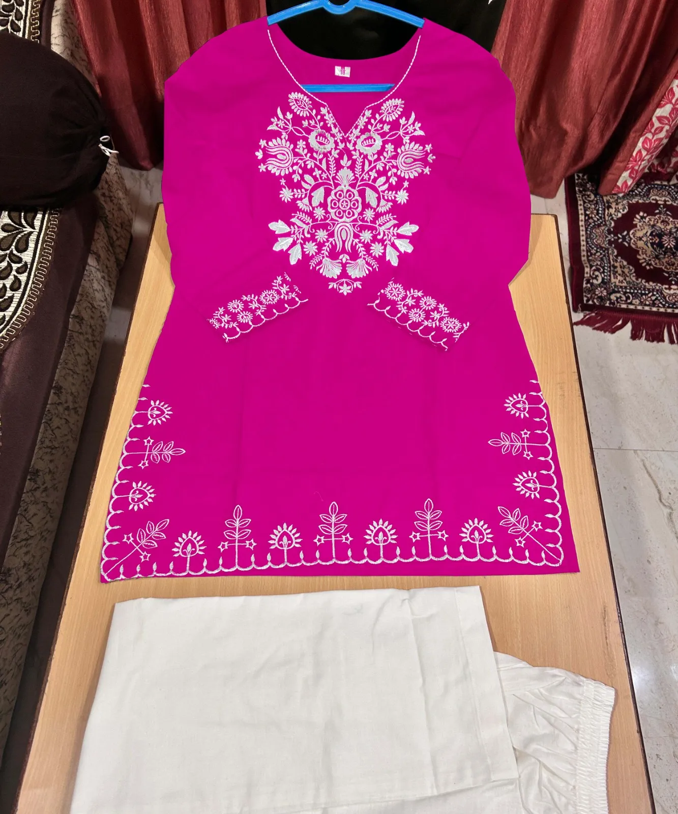 The stylish kurti features fine thread embroidery detailing on the front, neckline, sleeves, and hem, adding a delicate touch of traditional craftsmanship. The subtle embroidery enhances the overall design, creating a perfect balance between modern fashion and ethnic charm.