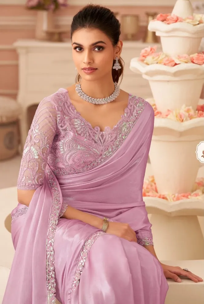 This graceful saree combines the soft femininity of Pink with a delicate touch of glamour. Crafted from flowing chiffon and paired with a rich Banglori silk blouse, this ensemble is perfect for engagement ceremonies, daytime weddings, and sophisticated gatherings.