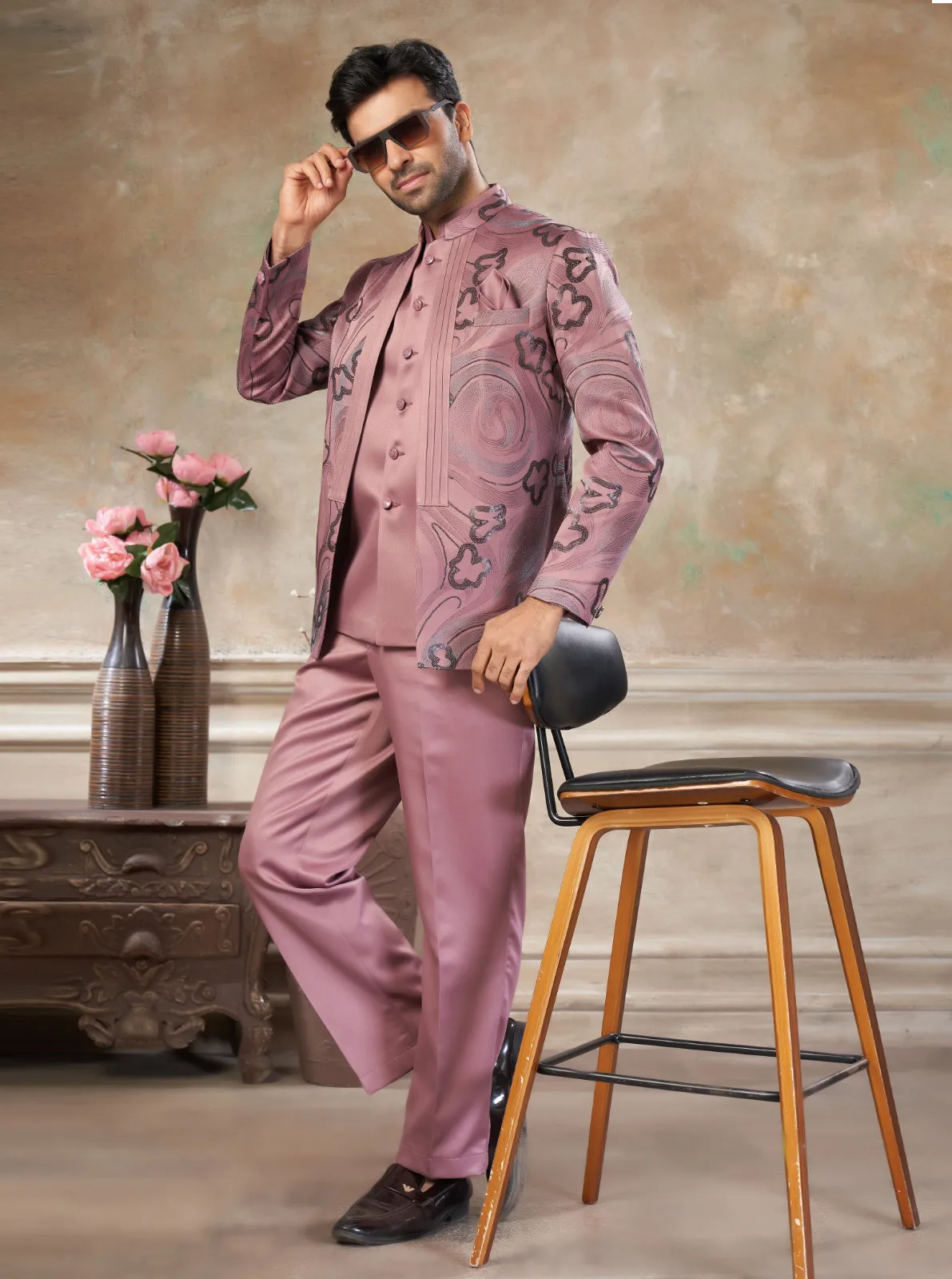 Make a vibrant and fashionable entrance with this bold Pink Terry Rayon Jodhpuri Collection suit. Combining the sharp tailoring of the Jodhpuri silhouette with luxurious imported fabric and dazzling sequin work, this set is designed for the modern celebratory wardrobe.