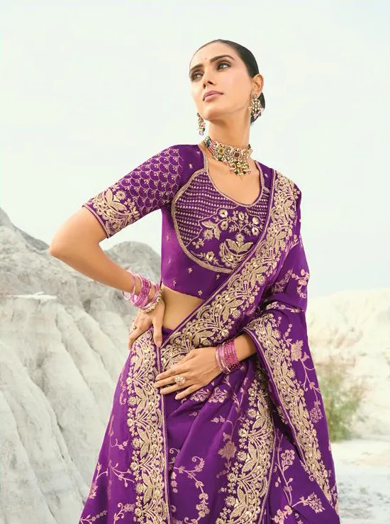 Premium purple pure dola viscose wedding saree with heavy zari, thread, moti and cut dana embroidery work. Comes with rich pure silk blouse. Ideal for weddings, receptions & festive occasions.
