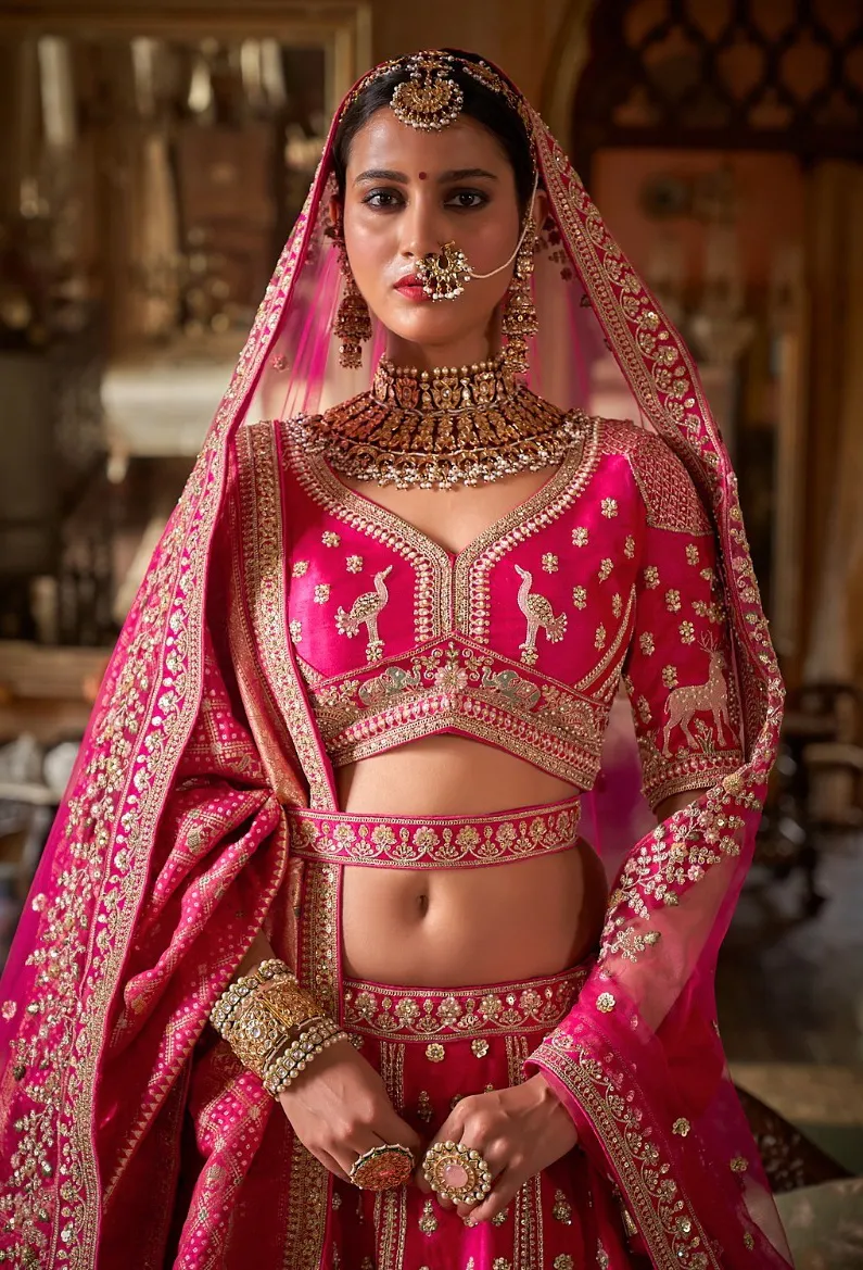 Make a bold and beautiful bridal statement with this rani pink bridal lehenga set, crafted to reflect royal elegance and timeless tradition. Inspired by heritage designs, this ensemble is perfect for brides who want a vibrant yet classic wedding look.