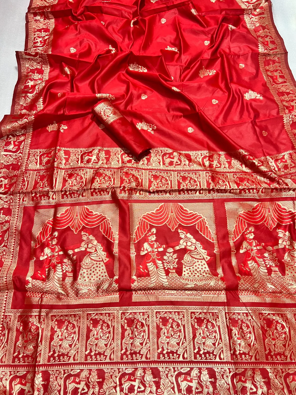 This magnificent Red Banarasi Soft Silk Weaving Work Saree is the epitome of traditional grandeur and luxurious texture. Banarasi silk is highly prized for its traditional weaving artistry. Featuring rich weaving work and a structured Banglori silk blouse, this ensemble is perfect for weddings, festivals, and all grand celebratory occasions.