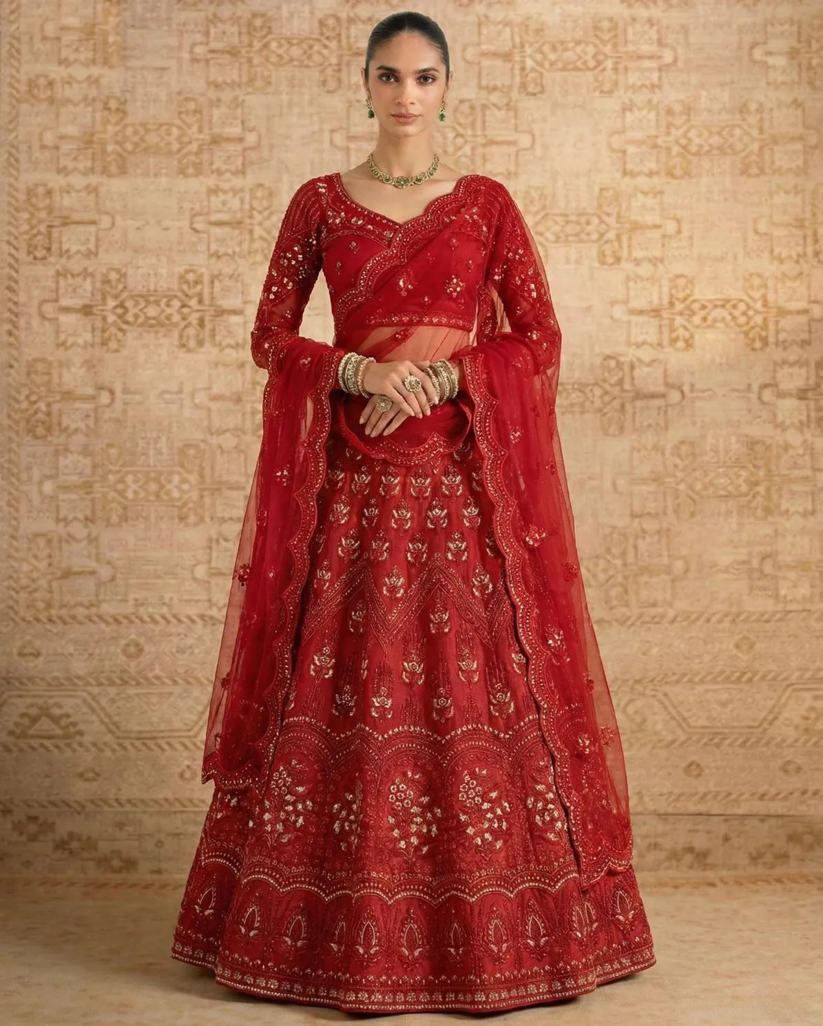 The matching embroidered dupatta with scalloped borders adds an extra layer of sophistication, completing the royal look. This unstitched lehenga set allows customization according to your preferred fit and design style.