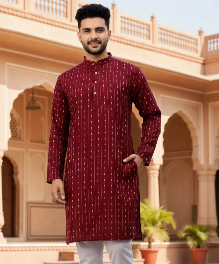 Kurta Fabric and Color: The Kurta is crafted from Cotton, ensuring breathability and comfort. The fabric features Jacquard Self Pattern in a classic Redย hue. This weaving technique creates tone-on-tone patterns directly into the fabric, adding subtle depth without visible surface embroidery.