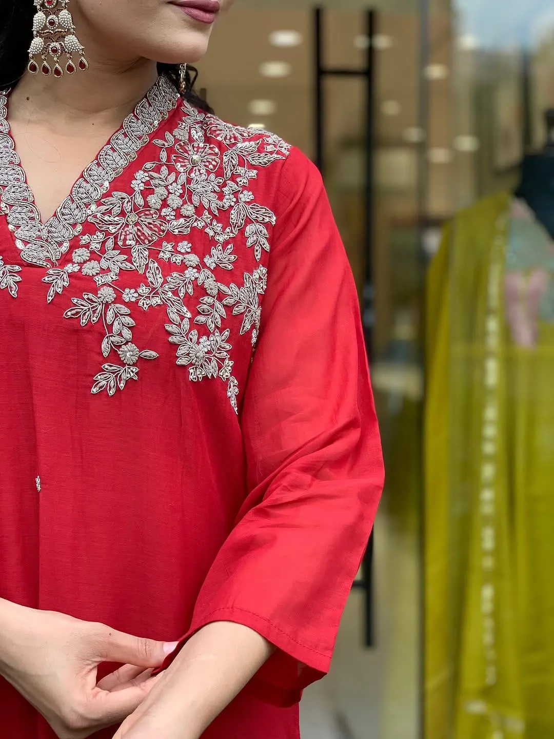Red Pure Viscose Chanderi Embroidered Readymade Salwar Suit