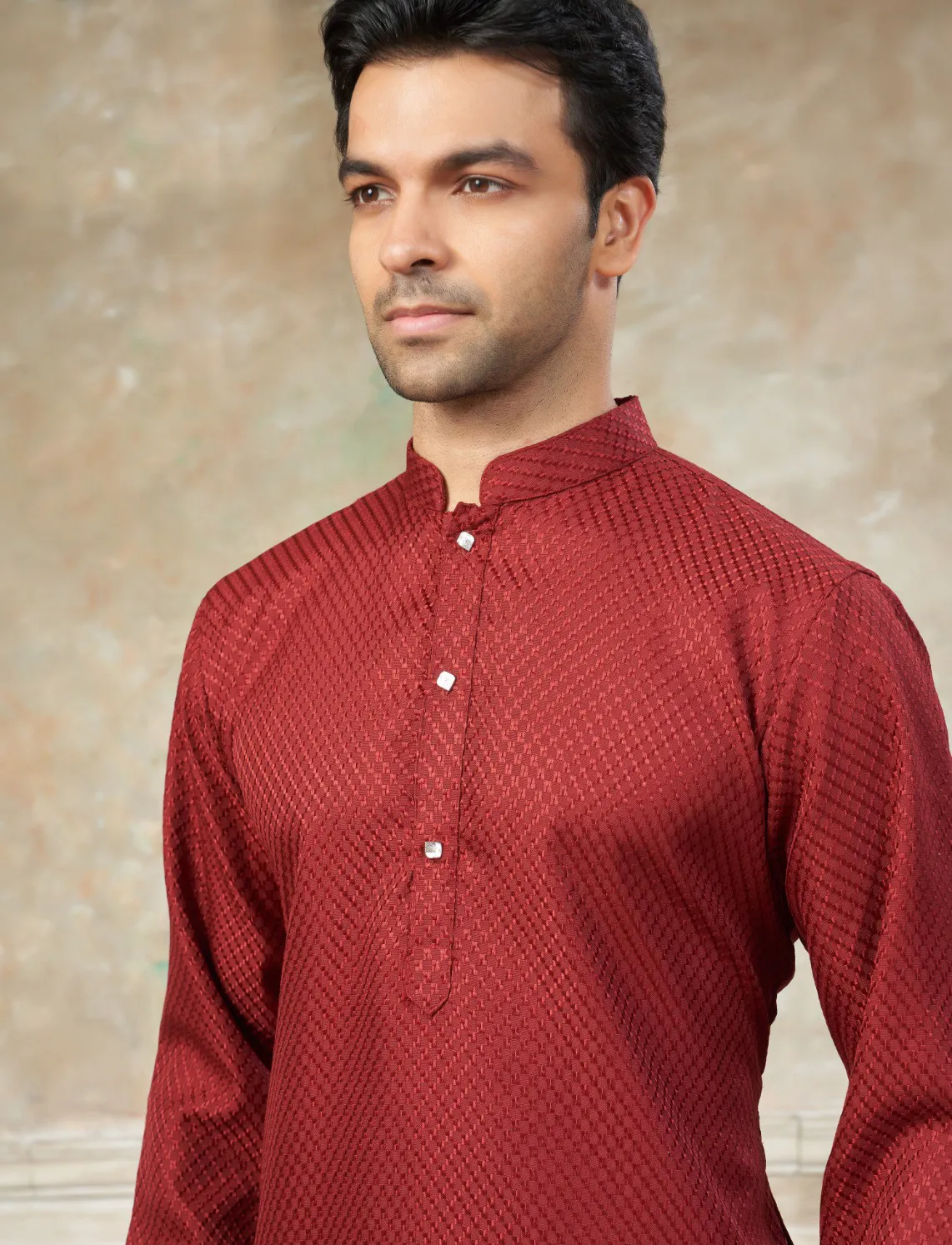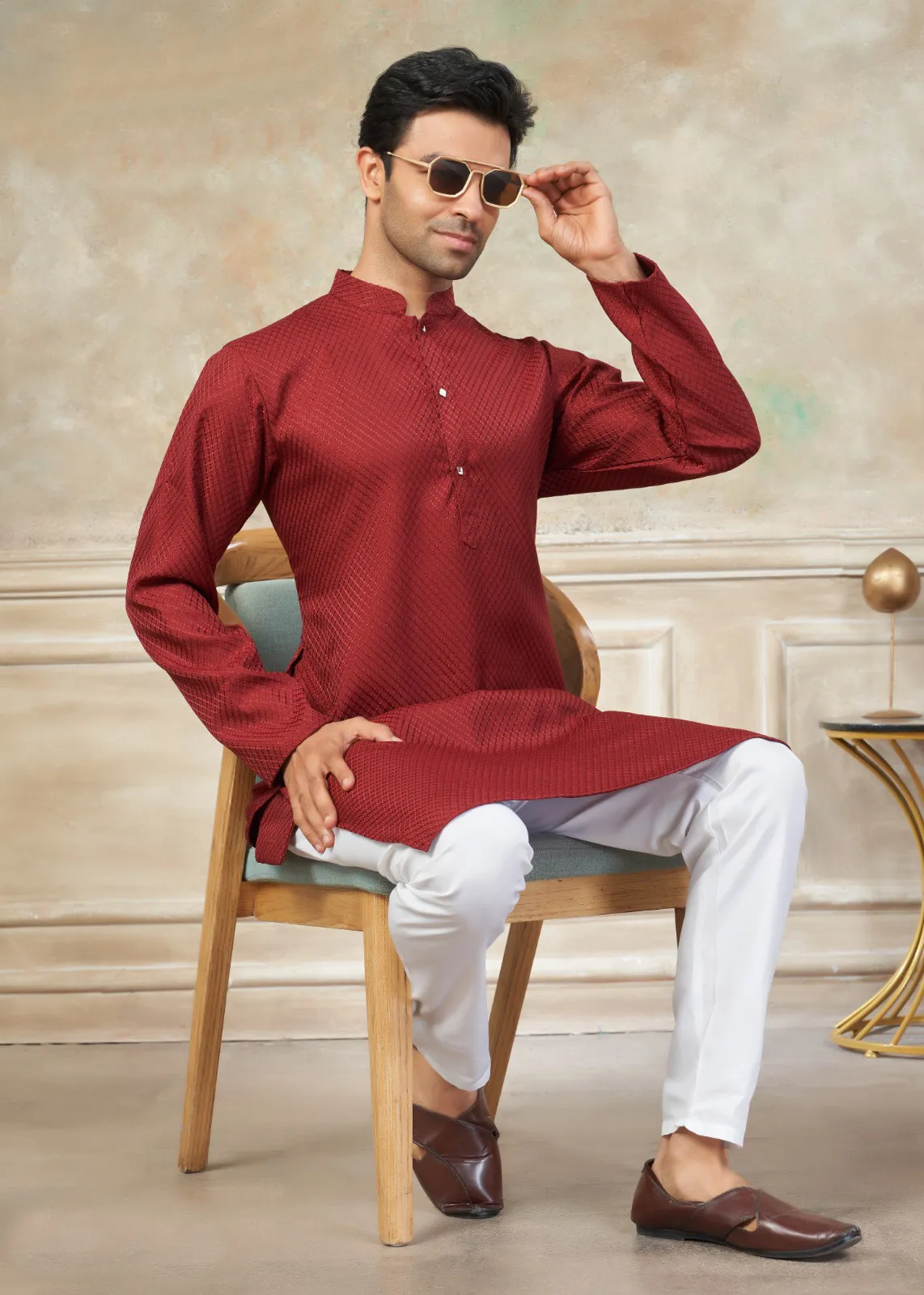 Add elegance to your ethnic collection with this Red Rayon Cotton Schiffli Work Men’s Kurta Pyjama. Designed for comfort and style, this outfit is crafted from premium rayon cotton fabric, making it lightweight, breathable, and perfect for long festive occasions.