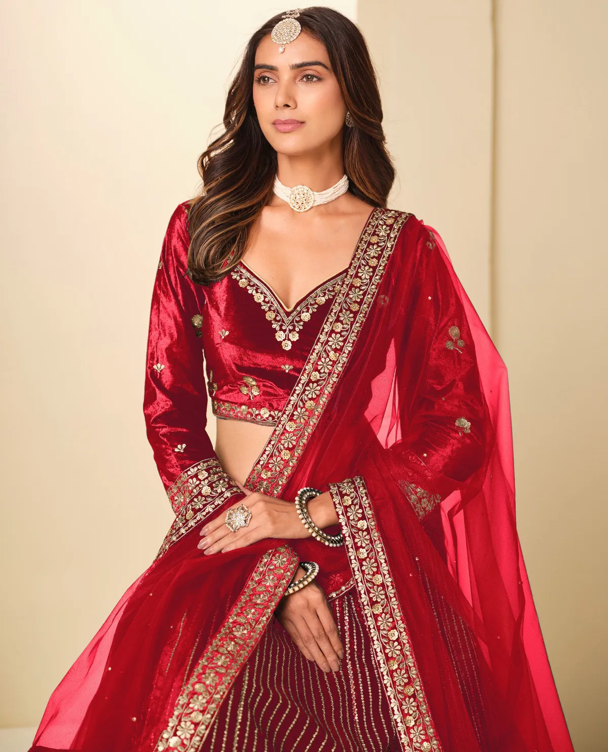 Make a bold and royal style statement with this Red Velvet Golden Embroidered Party Wear Lehenga Choli, designed for grand celebrations and special occasions. Crafted from premium velvet fabric, the lehenga offers a rich look with a soft and luxurious feel.