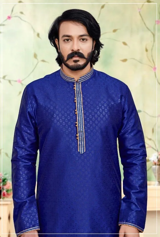 Royal Blue Jacquard Silk Amboj Work Men’s Kurta Pyjama