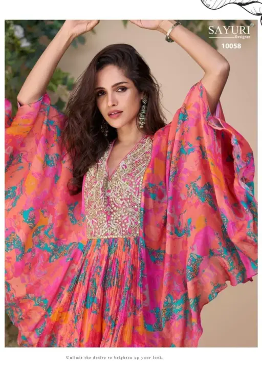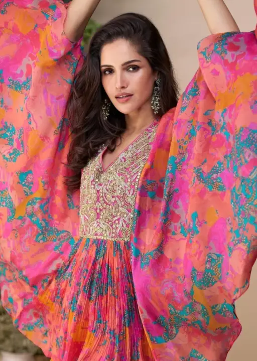 | Details | Premium Real Chinon Silk ( Embroidered Top With Hand Embellished Work Poncho Style With Plazzo ) |