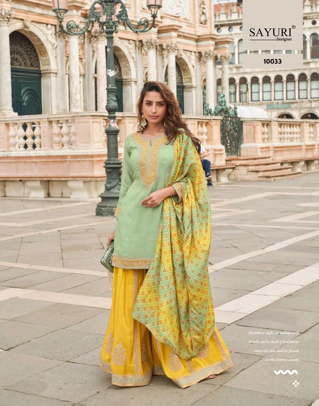 Details Premium Real Simar Silk / Viscos Jacquard Silk / Real Chinon Silk (Heavy festive look top with front and back embroidered sharara with digital embroidered dupatta)