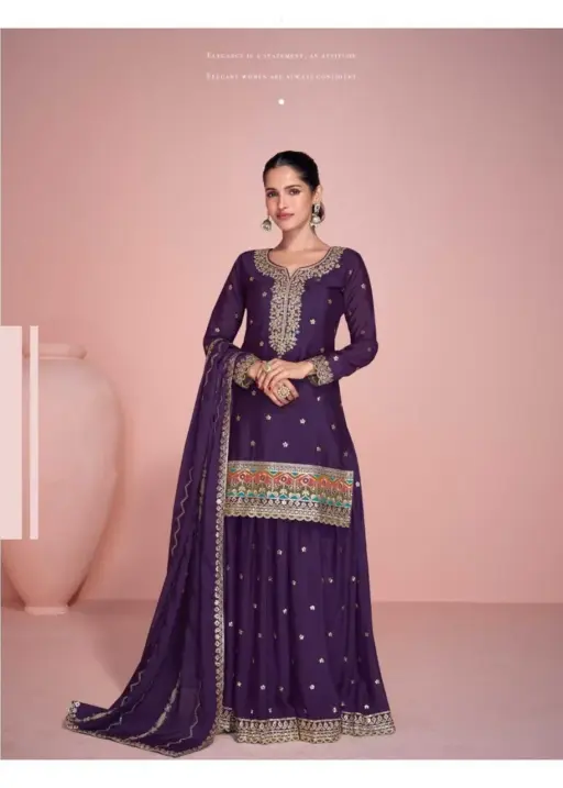 Details Premium Real Chinnon Silk / Premium Silk (Heavy Look Embroidered Chinnon Silk Top with Front and Back Embroidered Sharara, Embroidered Dupatta)