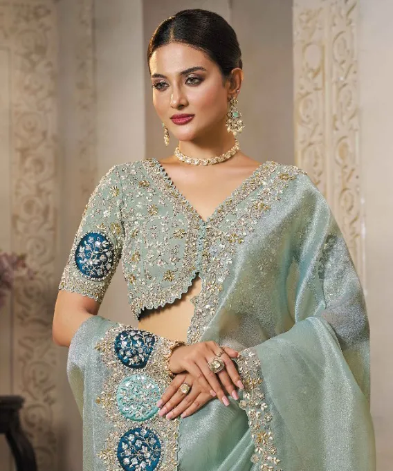 This exquisite Sea Green Organza Tissue Silk Handwork Designer Saree is crafted for graceful elegance and a dazzling presence. The combination of sheer, structured Organza Tissue Silk with rich, hand-applied embroidery makes this ensemble perfect for receptions, formal parties, and grand festive occasions.