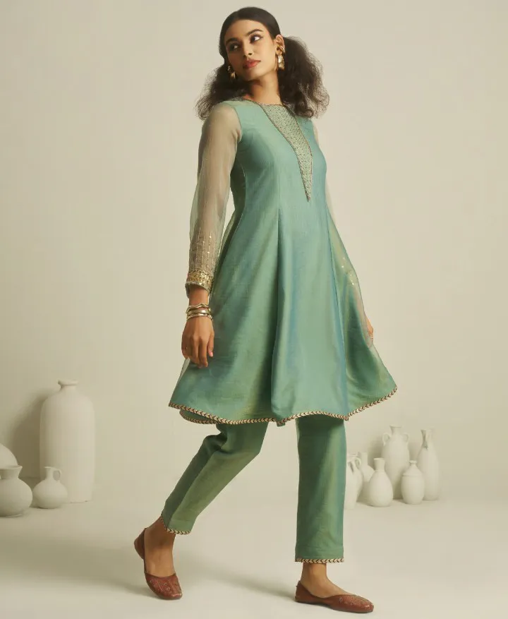 Sea Green Pure Tissue Handwork Kurti With Pant
