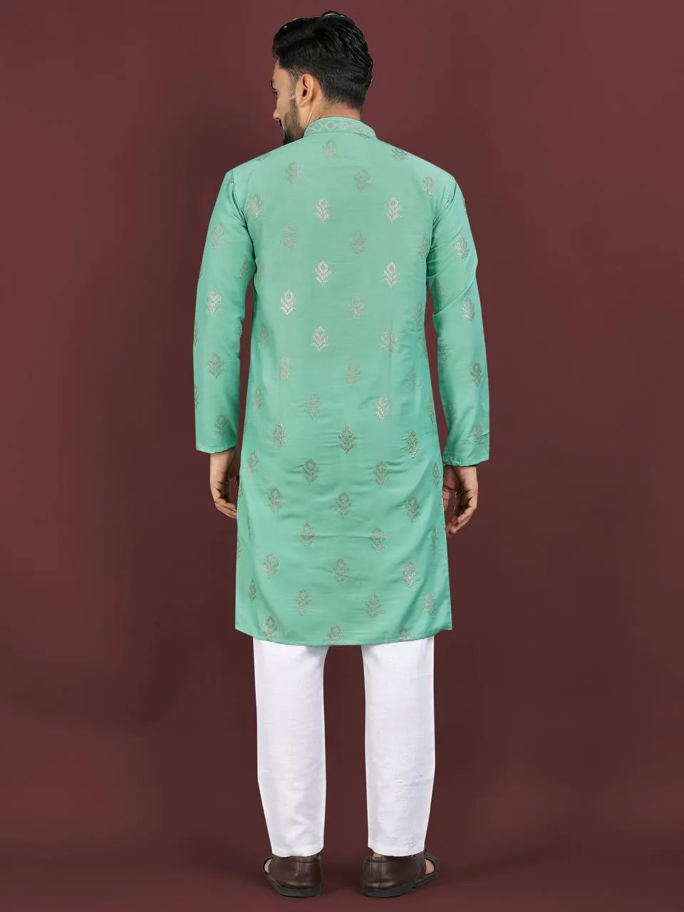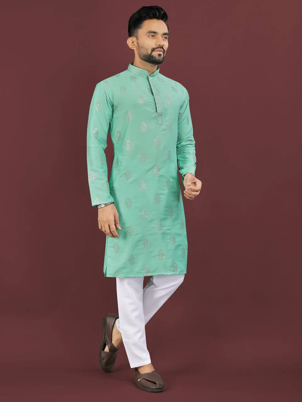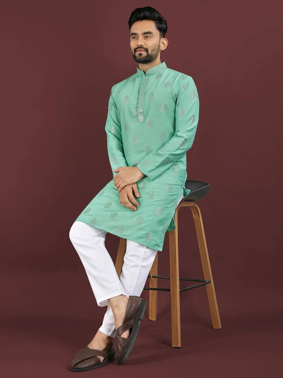 Step into the spotlight with this exquisite Sea Green Viscose Silk Embroidered Sequence Men’s Kurta Pajama. Combining the purity of Sea Green with a subtle shimmer, this outfit is designed for grand occasions, ensuring a regal and sophisticated appearance with supreme comfort.
