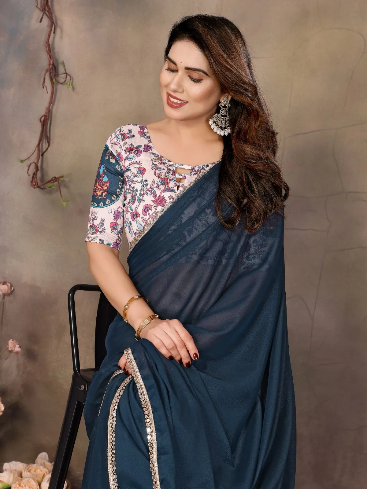 Saree Fabric and Color: The saree is crafted from lightweight and flowing Georgette, a fabric known for its excellent drape and movement. The color is a deep, rich Teal Blue, a modern and elegant choice.