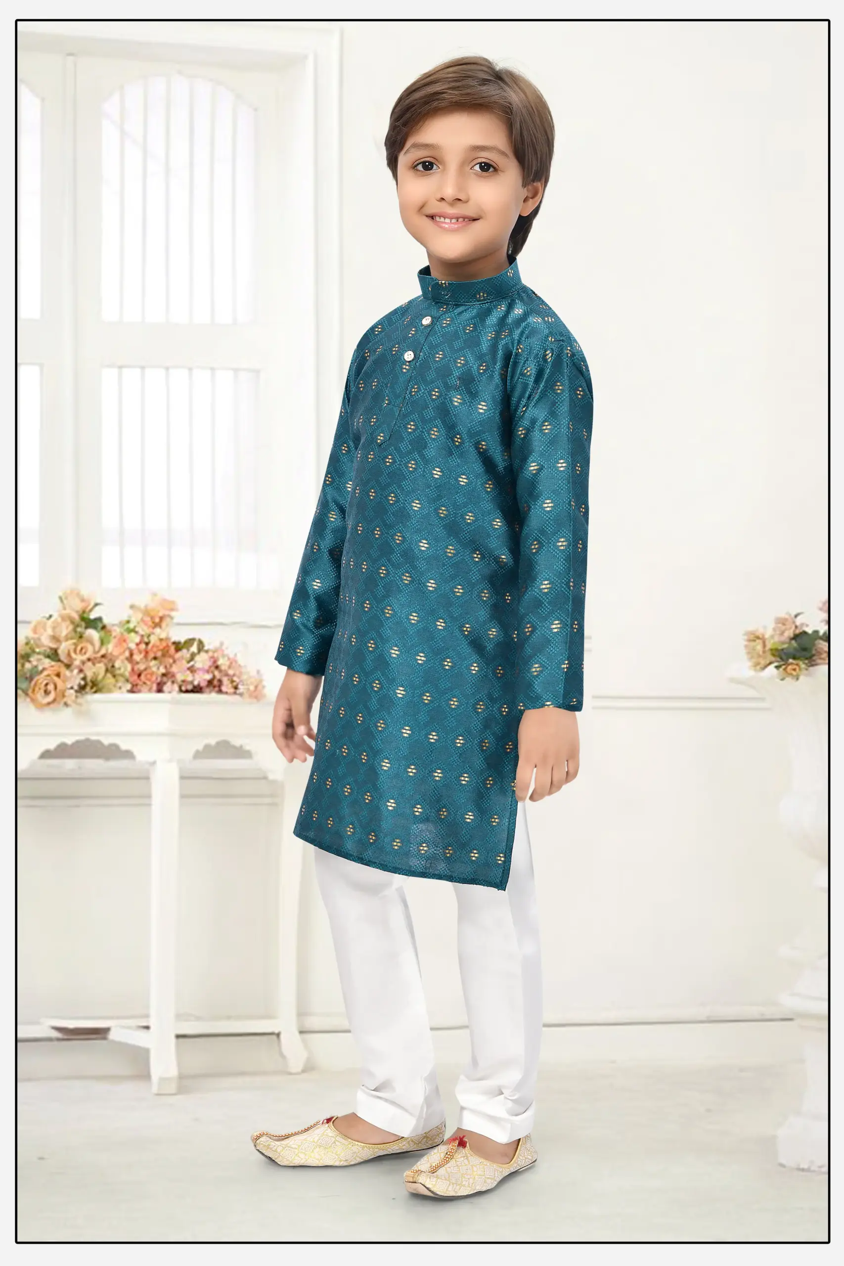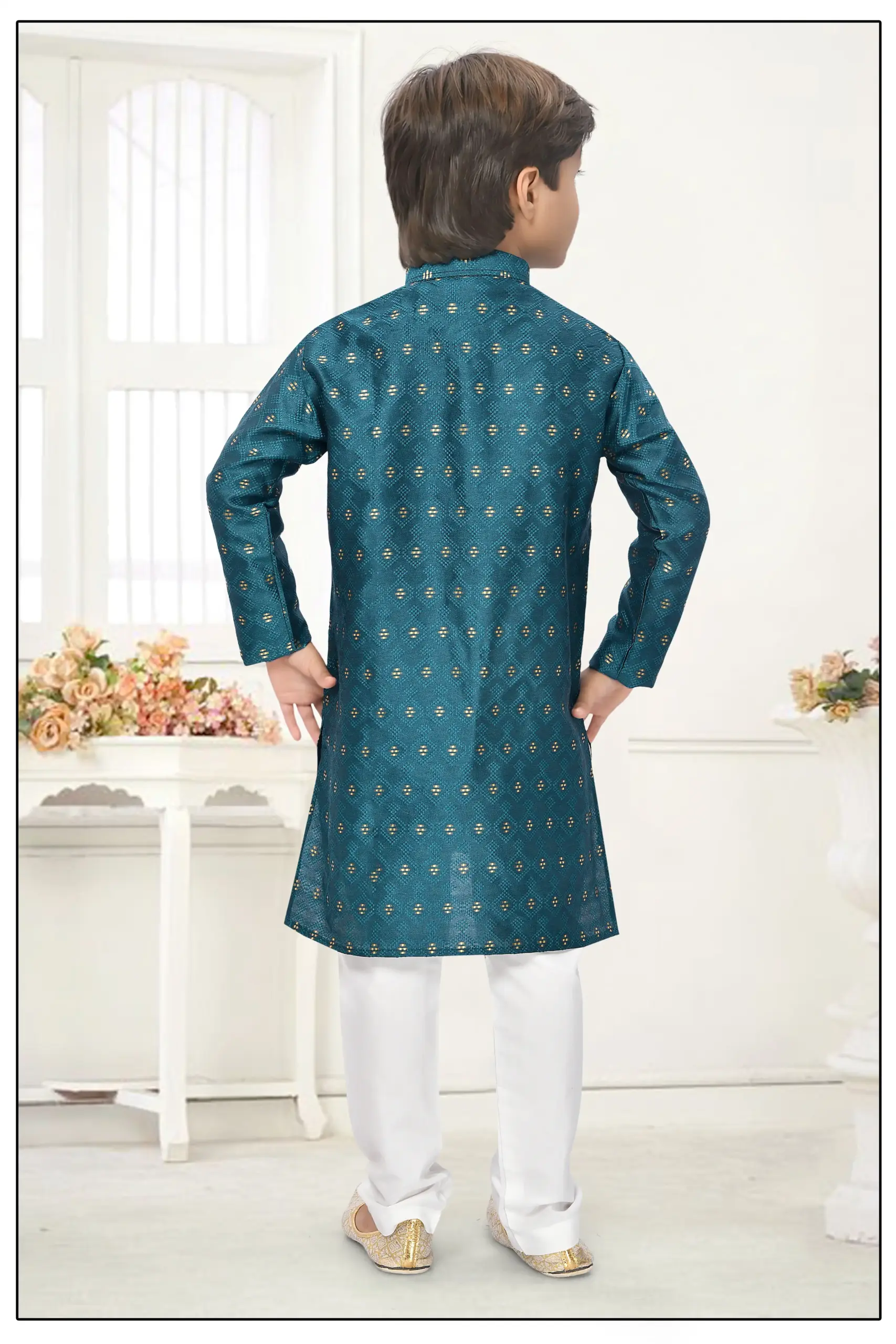 Dress your young one in sophisticated style with this handsome Teal Blueย Jacquard Zari Work Kid’s Kurta Set. The rich texture of the jacquard fabric, combined with dazzling Zari work, makes this outfit perfect for weddings, festivals, and special family functions.