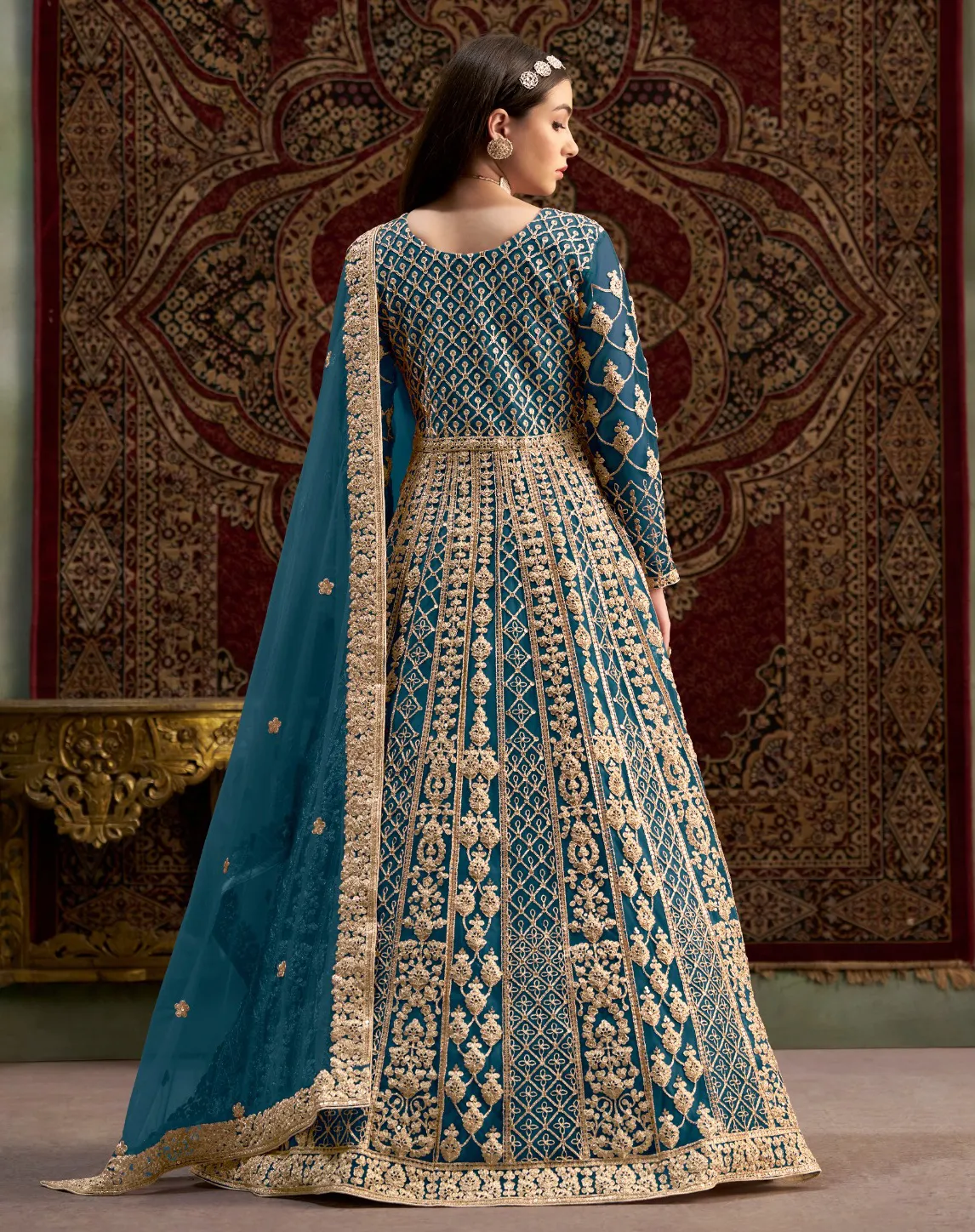 Make a striking statement at any formal event or wedding function with this exquisite Teal Net Heavy Embroidered Wedding Wear Gown. The flowing net fabric, paired with rich embroidery and a matching net dupatta, creates a look of timeless elegance and opulence.