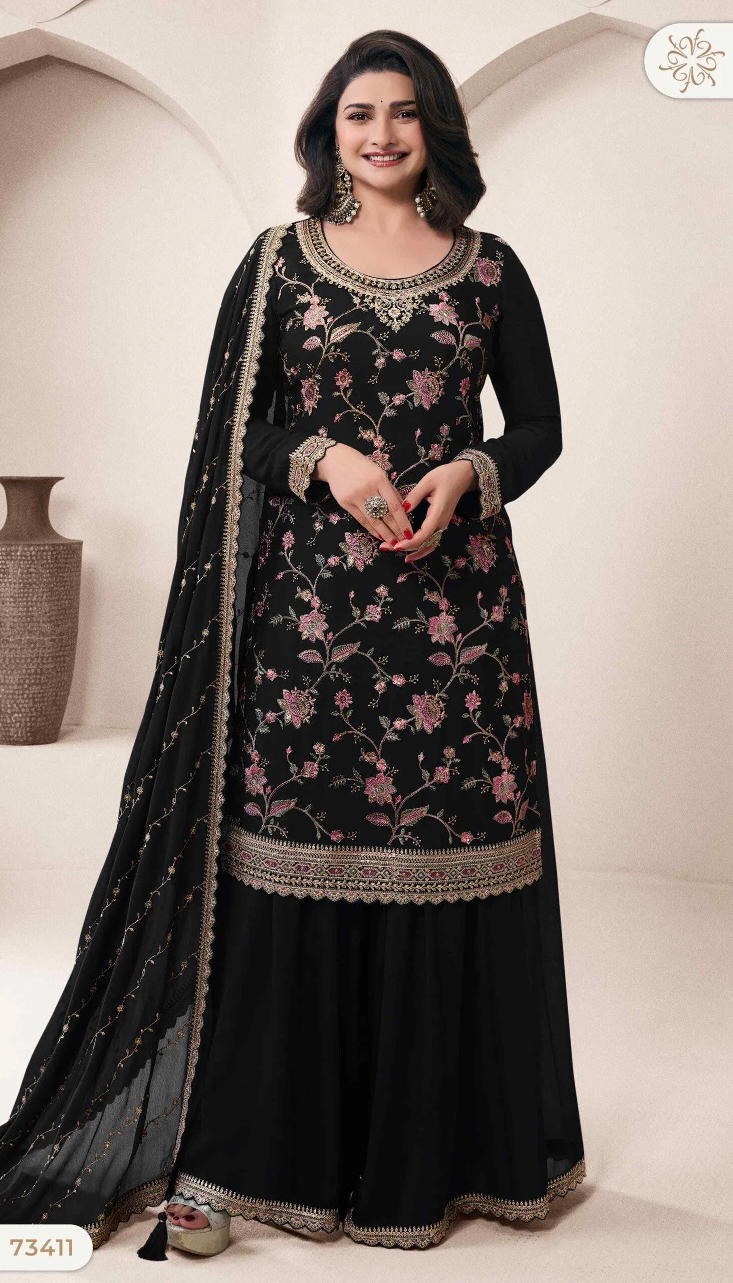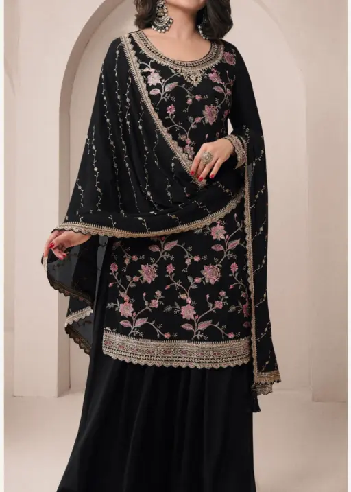| Details | Multy Thread Emb Chinnon Top ( Semi Stitch ) with Emb Chinnon Sharara ( Stitch ), Multy Thread Emb Chinnon Dupatta |