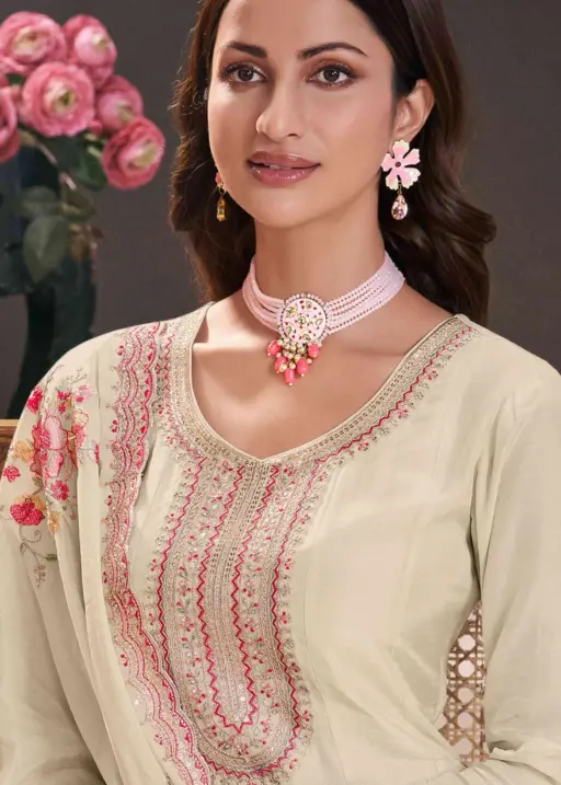 | Details | Thread Emb Moonga Silk Top, Santoon Bottom, Multy Thread Emb Silk Georgette Dupatta ( Semi Stitched Product ) |