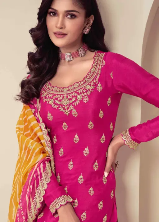| Details | Embroidered Chinnon Top (Semi Stitch), Embroidered Chinnon Sharara Bottom (Stitched), Digital Printed Chinnon with Emb Work Dupatta |