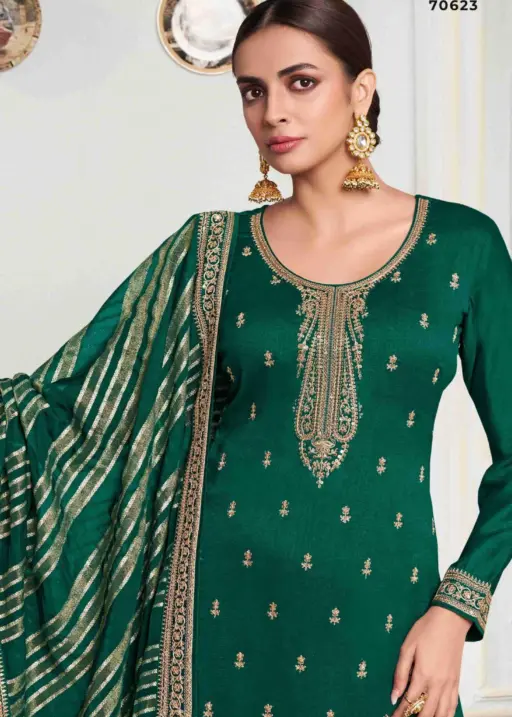 | Details | Embroidered Silk Georgette Top, Santoon Bottom, Self Weaved Organza Jacquard Dupatta ( Semi Stitched Product ) |