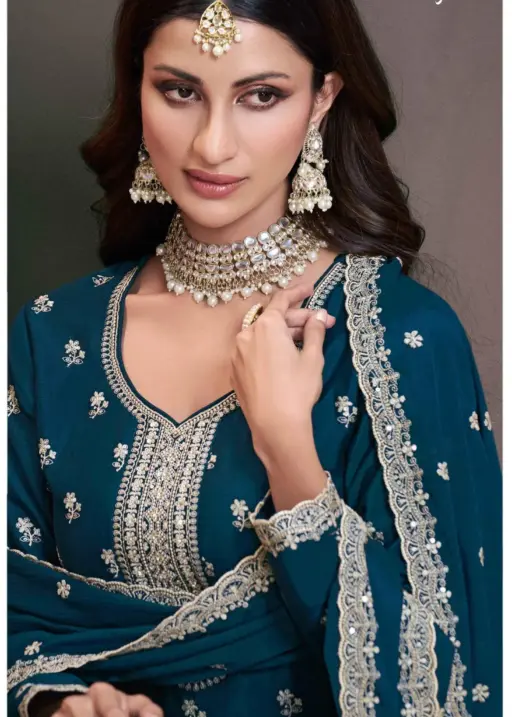 | Details | Designer Thread Embroidered Chinnon Top (Unstitched), Designer Thread Embroidered Sharara Bottom (Stitched), Designer Thread Embroidered Chinnon Dupatta |