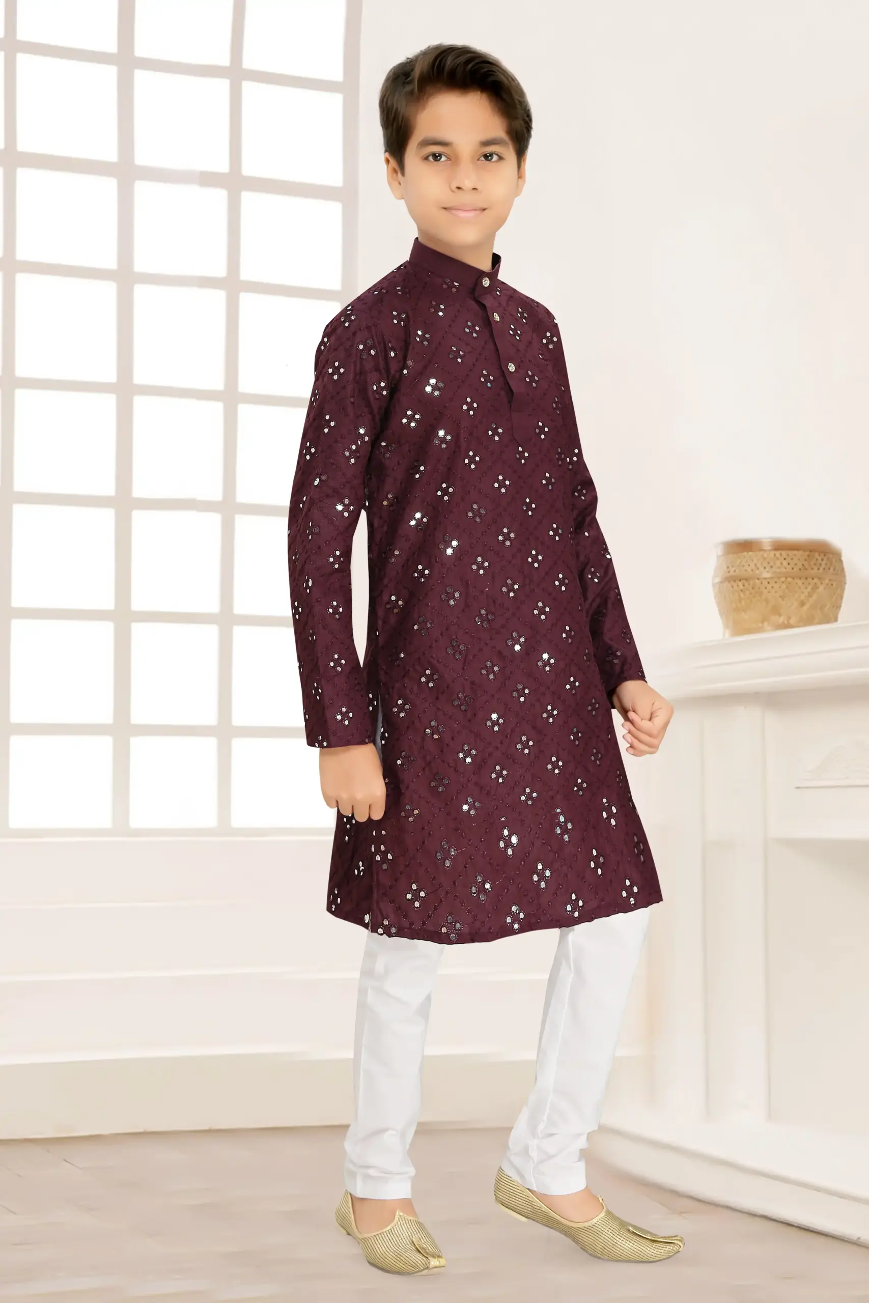 Wine Cotton Blend Mirror Work Kid’s Kurta Set