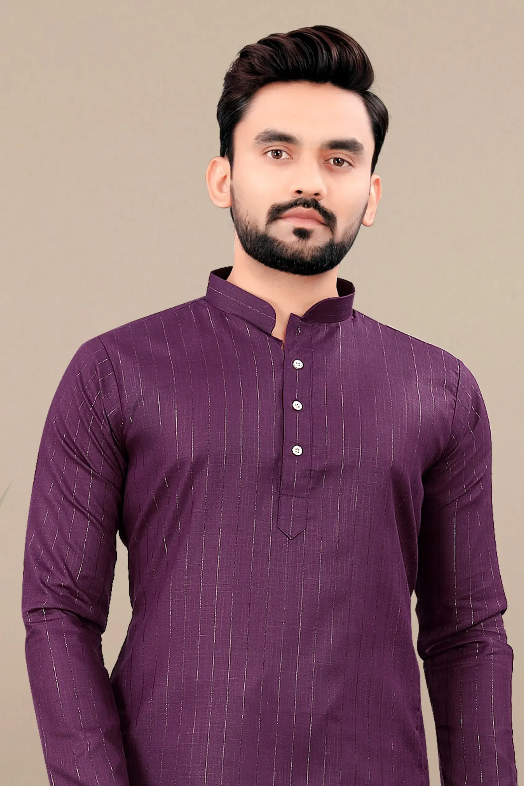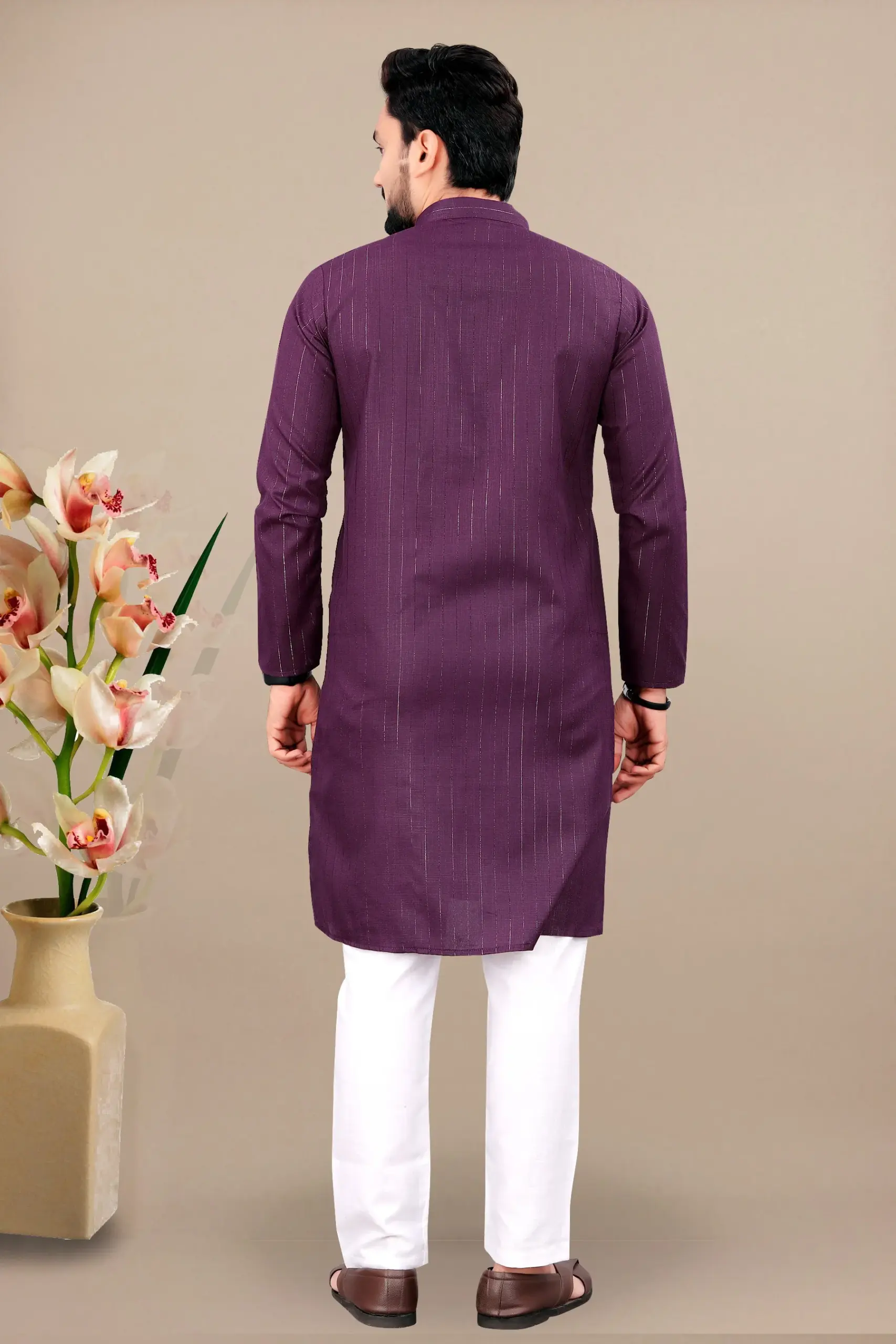 This versatile Wine Cotton Kurta Set offers classic style with a focus on comfort and structure. Featuring a simple lined black cotton kurta and a traditional white bottom, this ensemble is ideal for daily traditional wear, casual events, and small family functions.