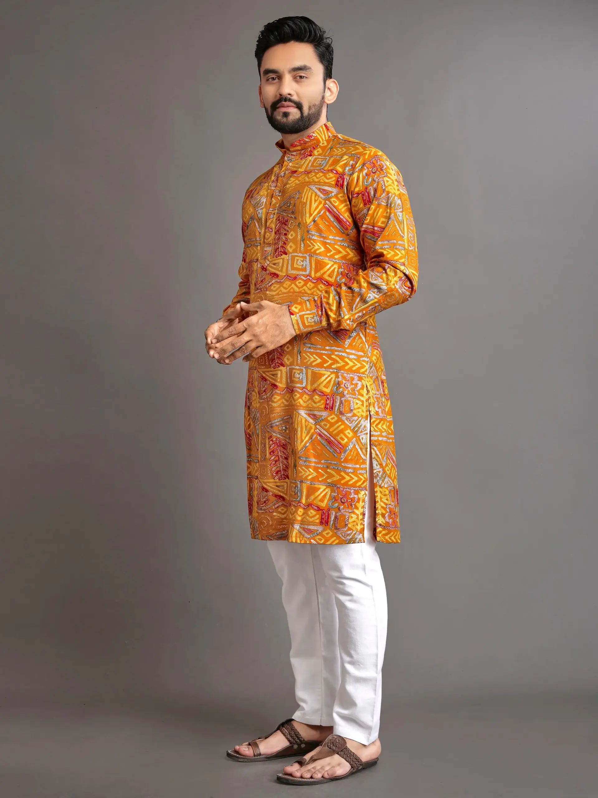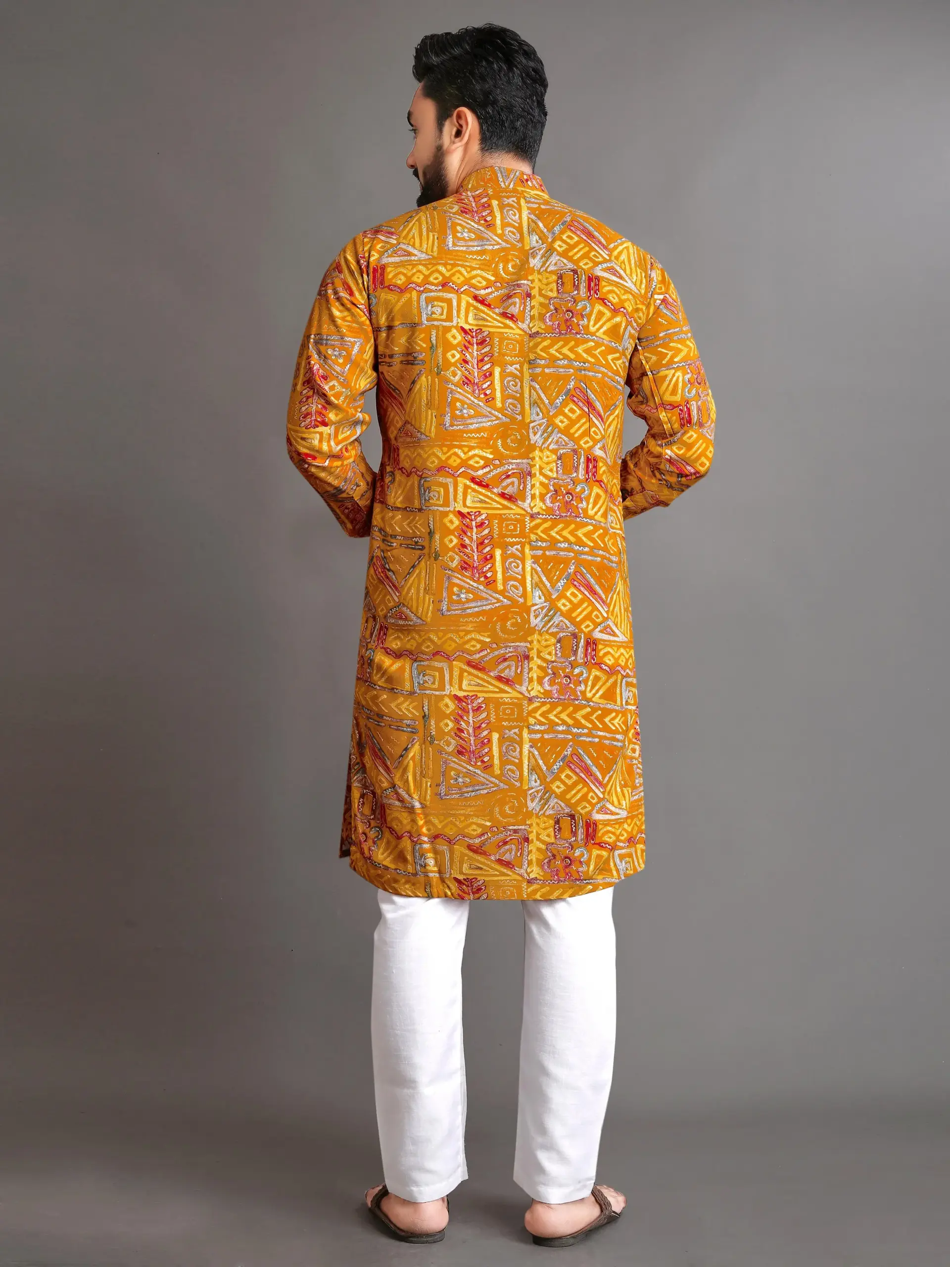 Make a striking, modern statement with this fashionable Yellow Cotton Foil Print Men’s Kurta Pyjama. Combining the comfort of pure cotton with the festive flash of metallic foil printing, this set is perfect for casual parties, festive occasions, and contemporary celebrations.