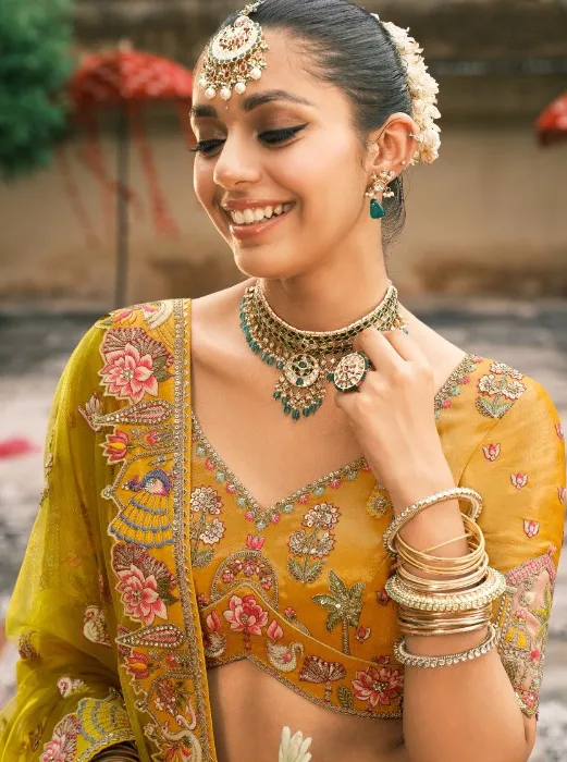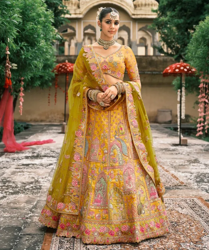 Color & Fabric: The lehenga features a vibrant combination of Yellow, colors traditionally associated with happiness and festivity. The Lehenga Fabric is Fancy Silk, known for its beautiful sheen and structured flow, ensuring a regal look.