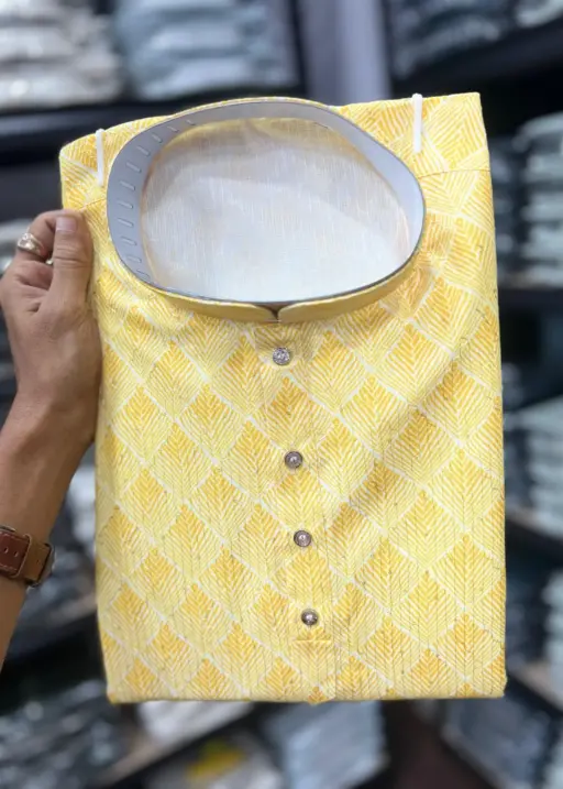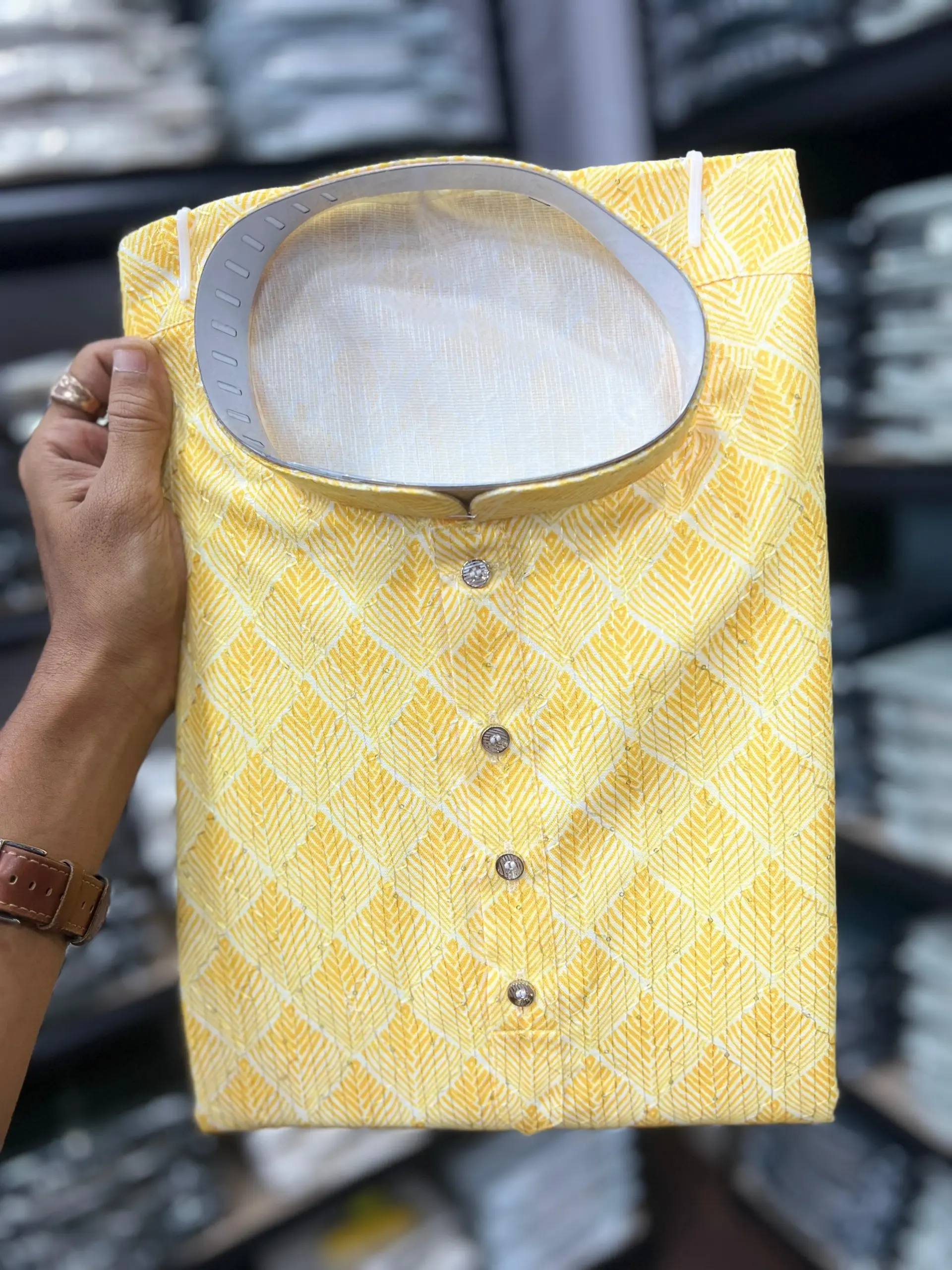 Step out in style with this eye-catching and comfortable Yellow Heavy Cotton Kurta Pyjama ensemble. Designed for both festive occasions and casual elegance, this set blends traditional artistry with modern wearability.