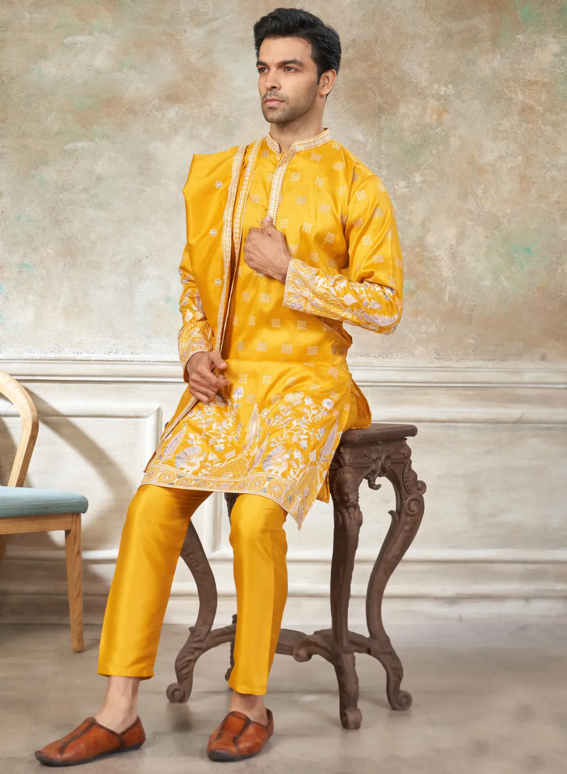 Yellow Pure Silk Embroidered Men’s Kurta Pajama Set With Silk Dupatta