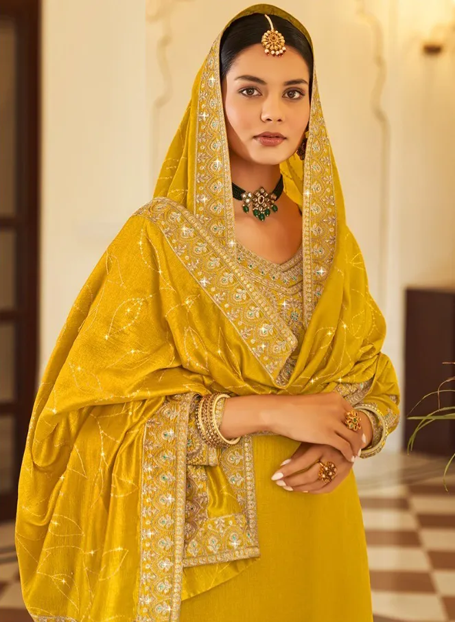Step into sophistication with this luxurious Yellow Pure Vichitra Embroidered Salwar Suit. The unique texture of the Vichitra silk and the rich embroidery make this a perfect choice for weddings, formal parties, and grand festive occasions.