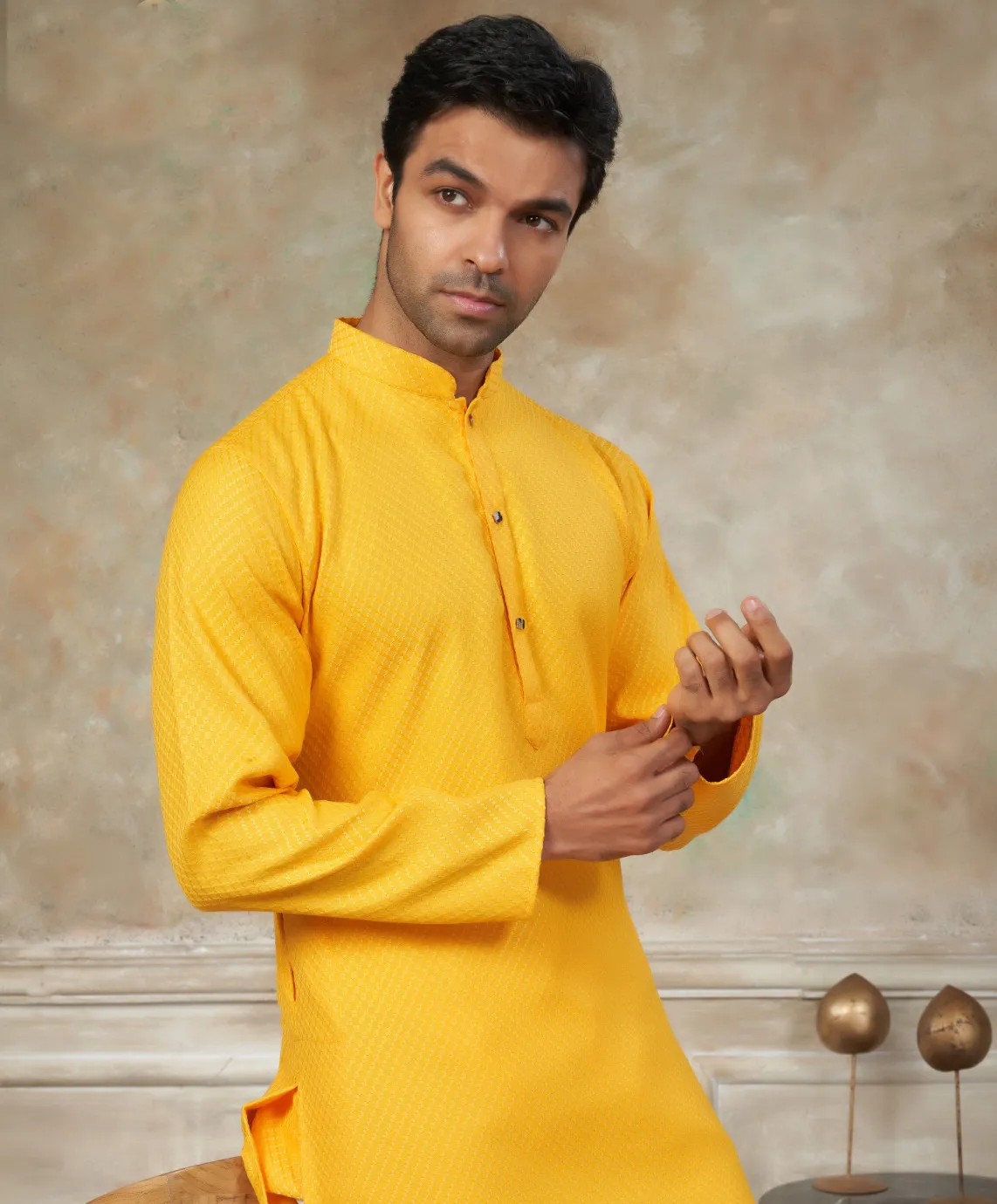 Add elegance to your ethnic collection with this Yellow Rayon Cotton Schiffli Work Men’s Kurta Pyjama. Designed for comfort and style, this outfit is crafted from premium rayon cotton fabric, making it lightweight, breathable, and perfect for long festive occasions.